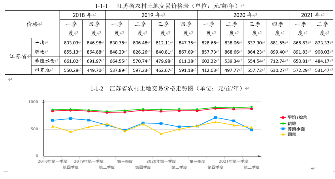 从绝对价格的走势看,2021年二季度通过平台流转的江苏省农村土地承包经营权流转交易价格呈现“稳中略升”趋势,上升幅度为4.84%,与上季度比上升0.52个百分点;从交易价格指数看,全省农村土地承包经营权交易综合价格定基指数为104.84(其中耕地为106.19),环比指数为100.52(其中耕地为101.82),同比指数为104.21(其中耕地为104.53);从交易品种看,平均价格为873.33元/年/亩,其中耕地、养殖水面、四荒地价格分别为908.03元/年/亩、484.17元/年/亩、531.47元/年/亩。此次价格指数同步在江苏省农村产权交易信息服务平台上发布(网址:www.jsnc.gov.cn),方便广大农户和新型经营主体等社会各方面查阅。